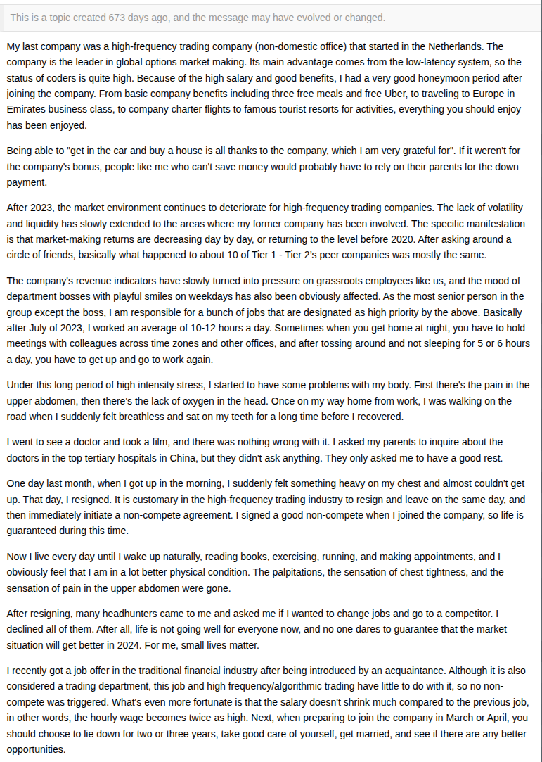 Well, I hope to leave soon, but the jist of it is that my time in trading was not very useful for being able to leave the country. I saw somebody with a bigtech company on their resume interviewing and they had a 10x easier time. They would get easier questions, and people would be happier to pass them through rounds. So I took one of the first big tech offers I got, and now I’m sitting around waiting to leave.