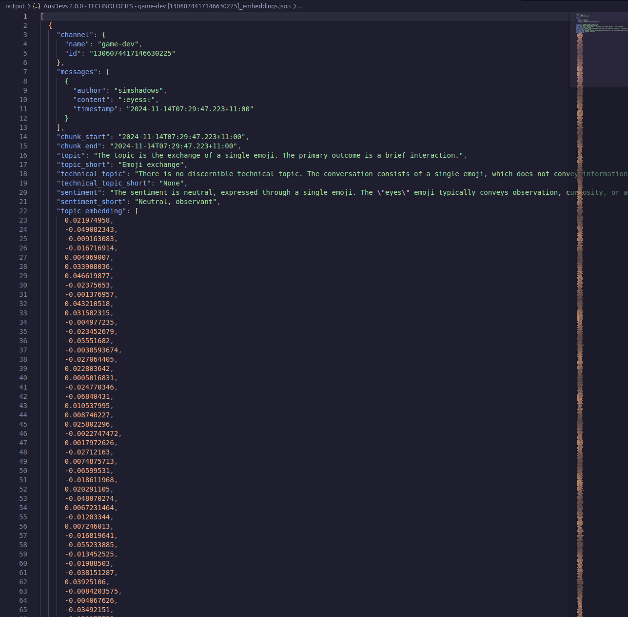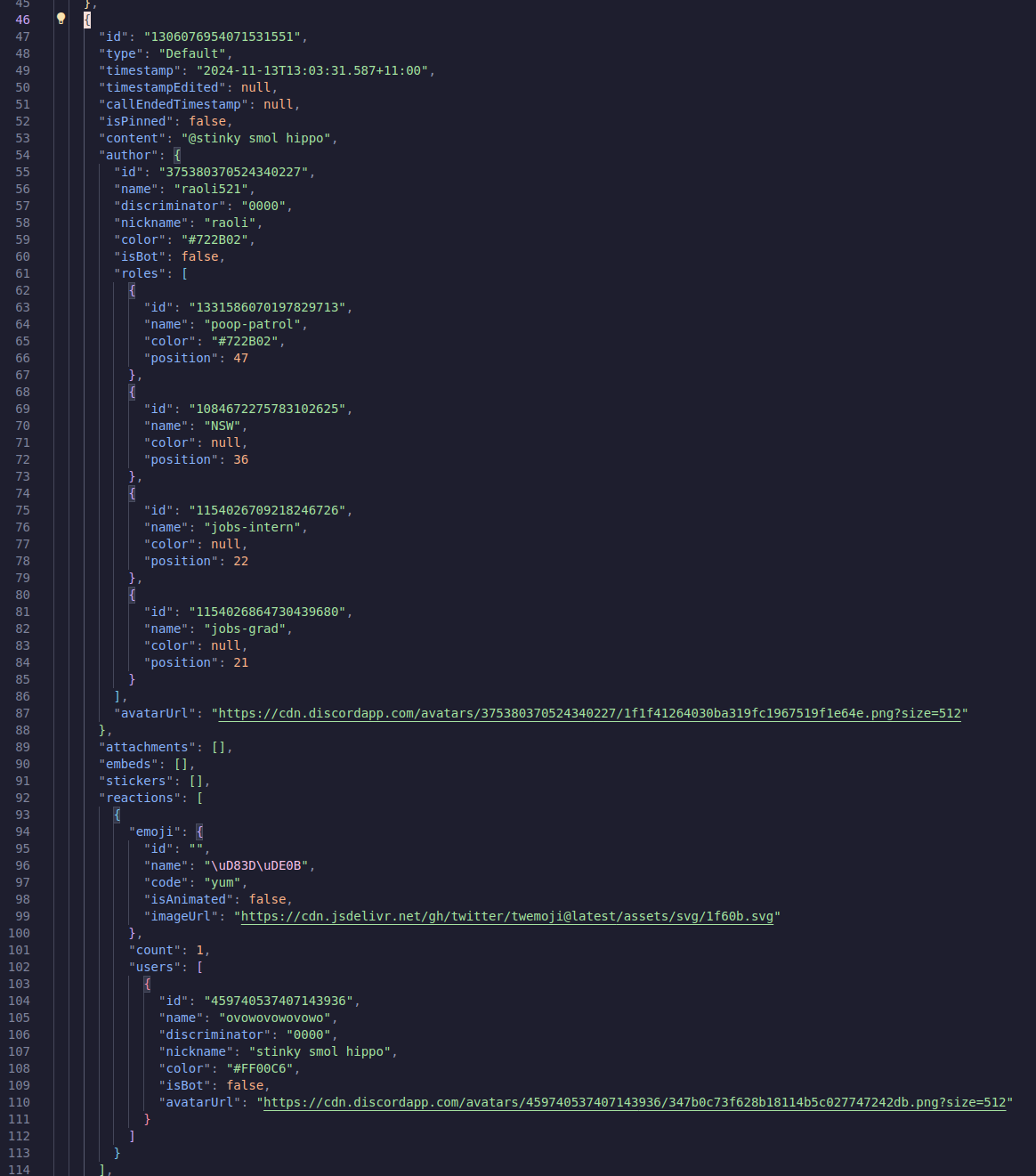 This message above is 126 lines of JSON meta data. Contains stuff like peoples roles, what emojis they used, what their username is, what the message’s unique ID is in discord’s database, so on and so on.