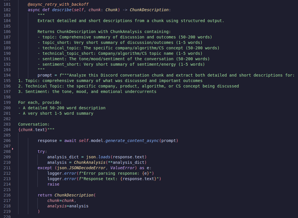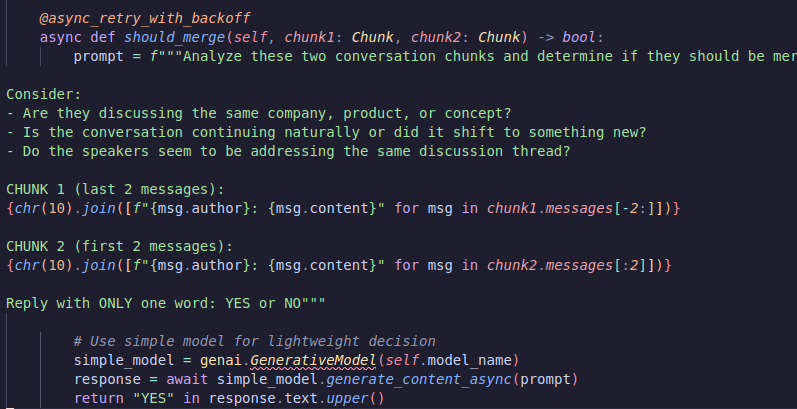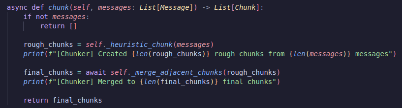 My feature engineering has three core classes. The chunker, the describer and the embedder. For chunking I first do a semantic chunk (maximum of 50 messages, split if there’s over 2 hours between two messages), then inside of my chunker I’ll ask the LLM whether or not I should merge these two together