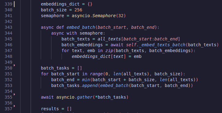 At first I ran this with 32 threads, then I realised that’s far too slow. We have something like 1 million messages, which is probably going to be 10 million tokens. I swapped over to asyncio, and made it spin up to 4,000 concurrent requests and-