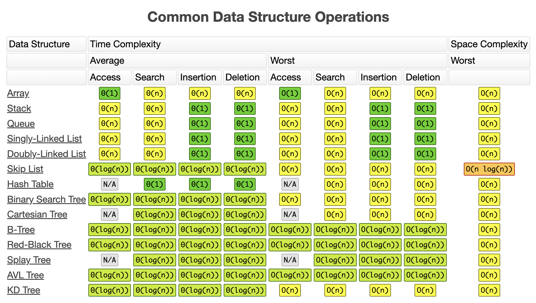 This is quite easy. If you’ve done enough leetcode, you should be able to say these front-to-back in your sleep. A good resource is bigocheatsheet.