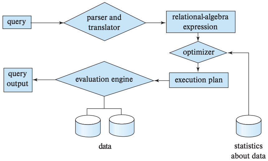 Most databases follow the structure shown in the diagram below, as illustrated in the Background section. Database systems parse Structured Query Language (SQL) into relational algebra (RA), optimise it, execute it, and materialise the results into a table. Database System Concepts.
