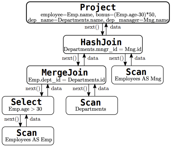 Non-compiler databases use a volcano operator model tree, such as