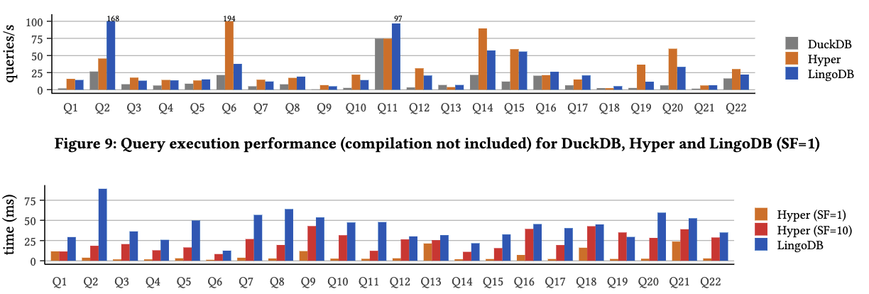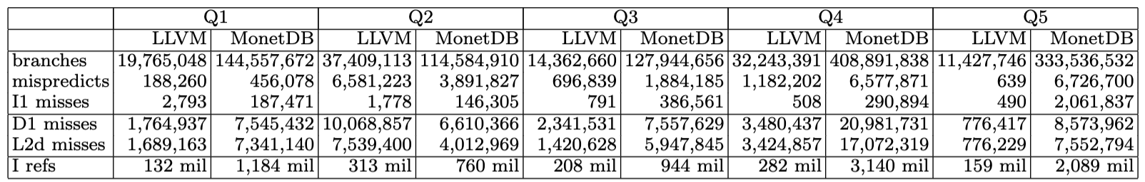 These observations led to the vectorized and compiled execution models. The vectorised model pulls multiple tuples up in a group rather than one at a time. A core advantage is that instructions per CPU cycle (IPC) can increase through single instruction, multiple data (SIMD) operations Compiled vs vectorised queries. However, this can cause deep copy operations to be required, or more disk spillage than necessary Vectorised execution vs storage. For instance, if a sort or a join allocates new space that is too large for the cache, the handling can become poor. and The Related Work chapter explore compilation approaches.
