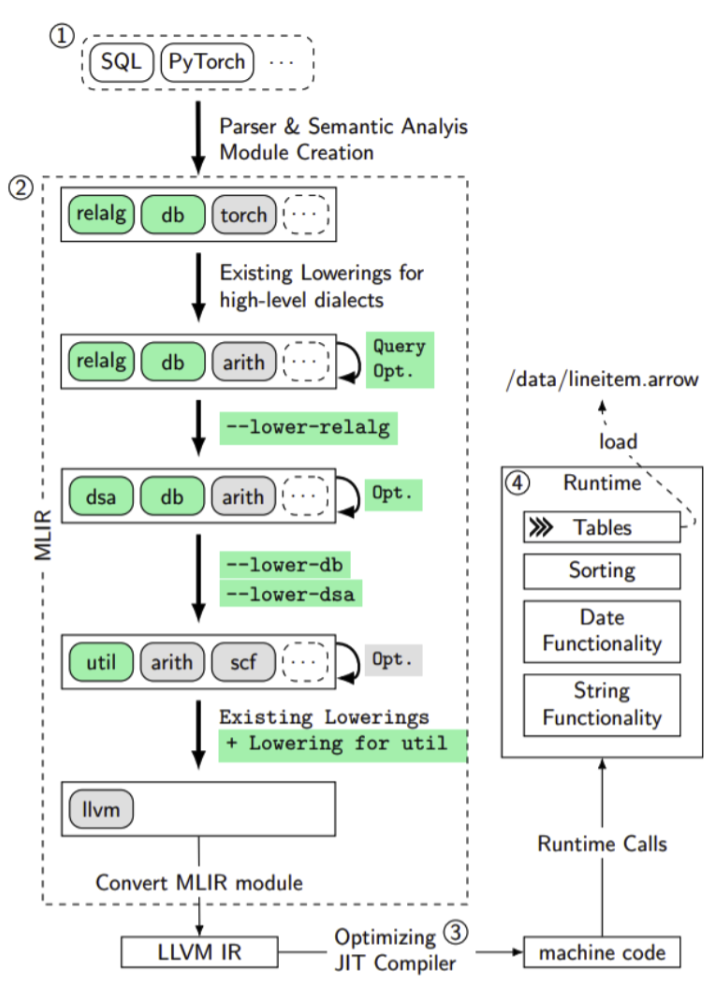 The LLVM Project is a compiler infrastructure that eliminates the need to re-implement common compiler optimisations, making it easier to build compilers LLVM paper. LLVM does not stand for anything in particular, and Multi-Level Intermediate Representation (MLIR) is another, newer toolkit that is tightly coupled with the LLVM project MLIR paper. It provides a framework to define custom dialects and progressively lower them to machine code. Developers can define high-level dialects that others can target and build upon.